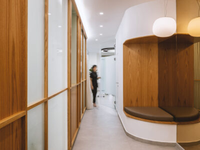 - Circulation fluide : Nous avons tracé un niveau horizontal continu à 2,2 m de hauteur. Ce « fil d’horizon » invisible relie l’ensemble des espaces (entrée, bar, salle) et guide la circulation de façon intuitive. Il est matérialisé par une série de grands luminaires sphériques suspendus, qui rythment l’espace et apportent un éclairage doux et uniforme.