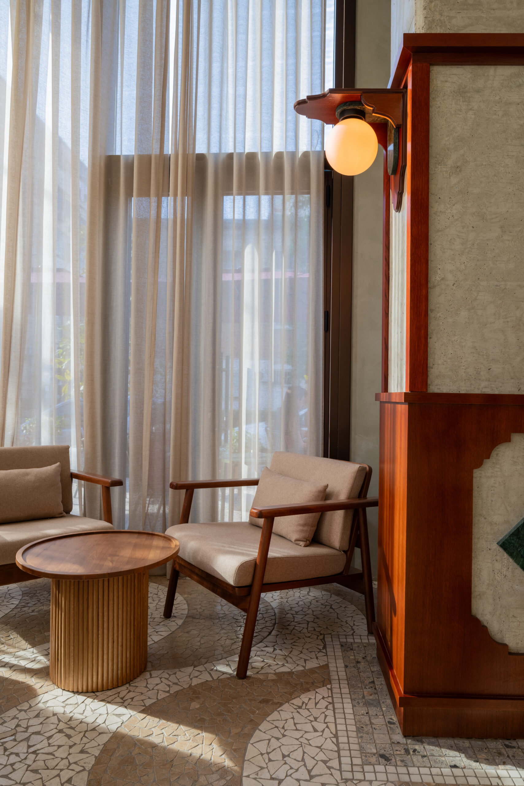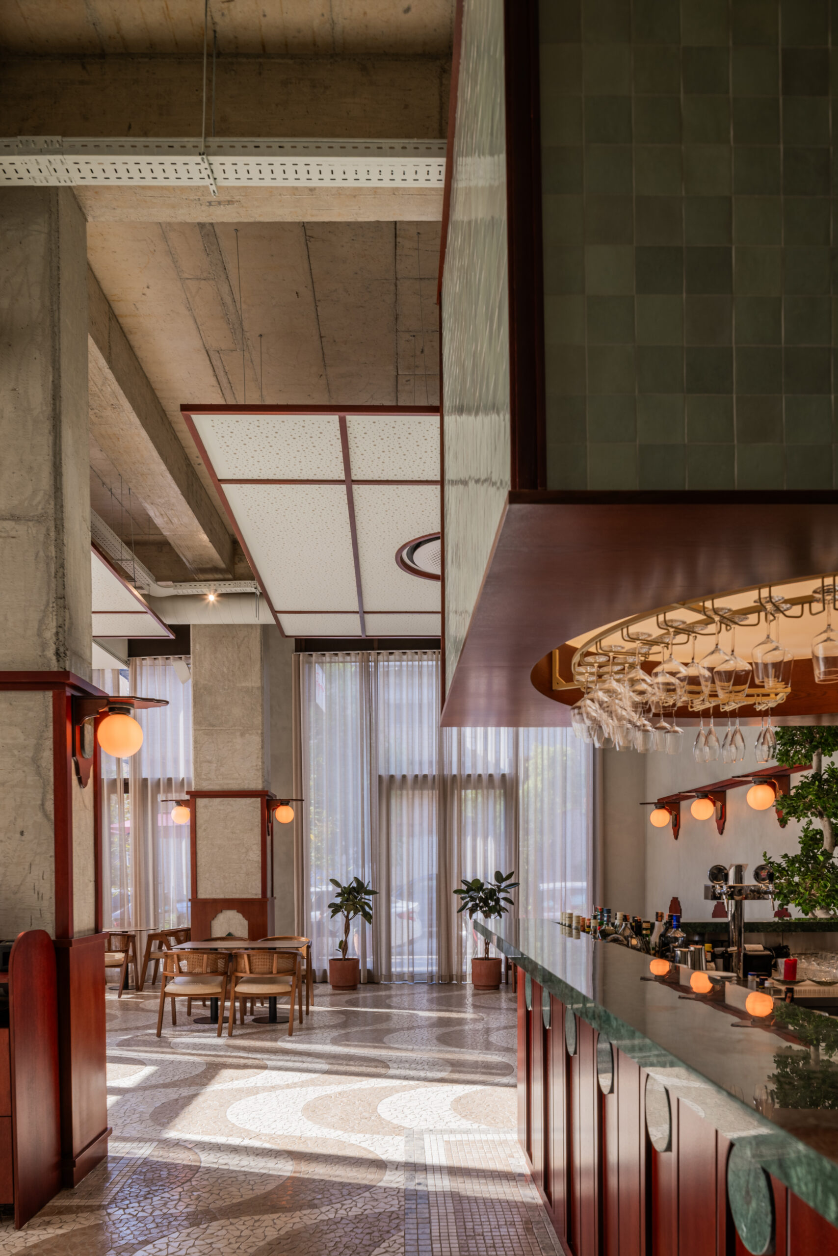 - Menuiserie sur mesure : Fabrication du bar suspendu, des étagères, des banquettes, et de détails en bois (revêtement mural partiel, etc.). Les artisans ont utilisé du bois brut teinté et traité contre les tâches.